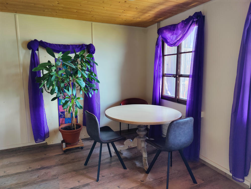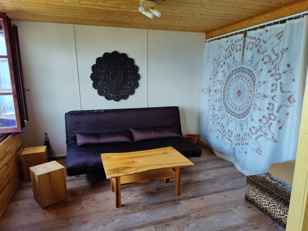 Das Wohnzimmer ist großzügig geschnitten und bietet ein Bettsofa (140 × 200 cm) und vier zusätzliche Matratzen für weitere Gäste sowie einen Esstisch mit Stühlen. Es gibt ausreichend Platz für Yoga, Bewegung oder entspanntes Beisammensein.