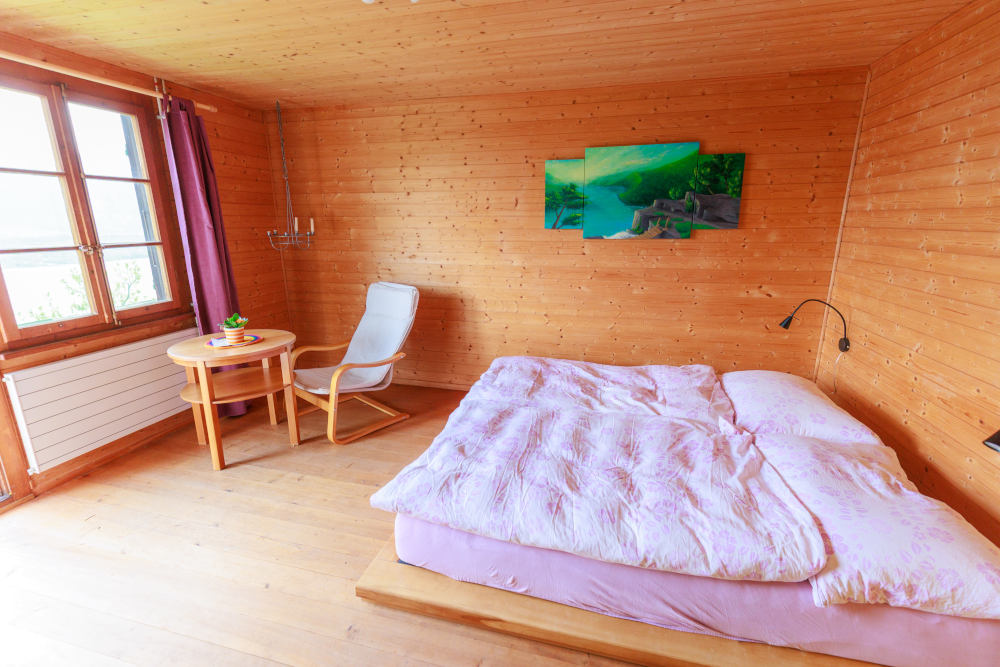 Im Schlafzimmer steht ein 200 cm breites Futonbett mit zwei sehr bequemen Swiss-Comfort-Matratzen.